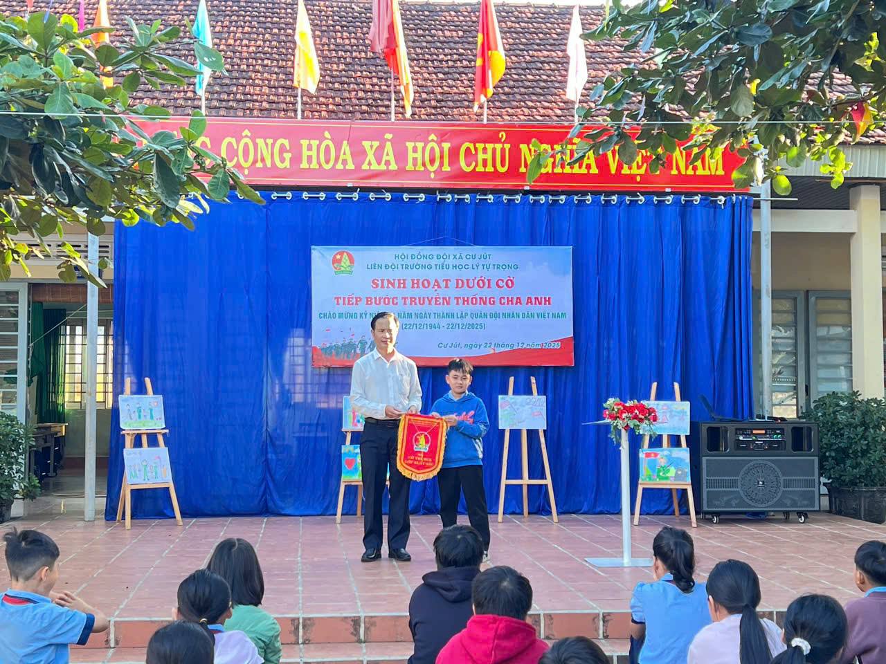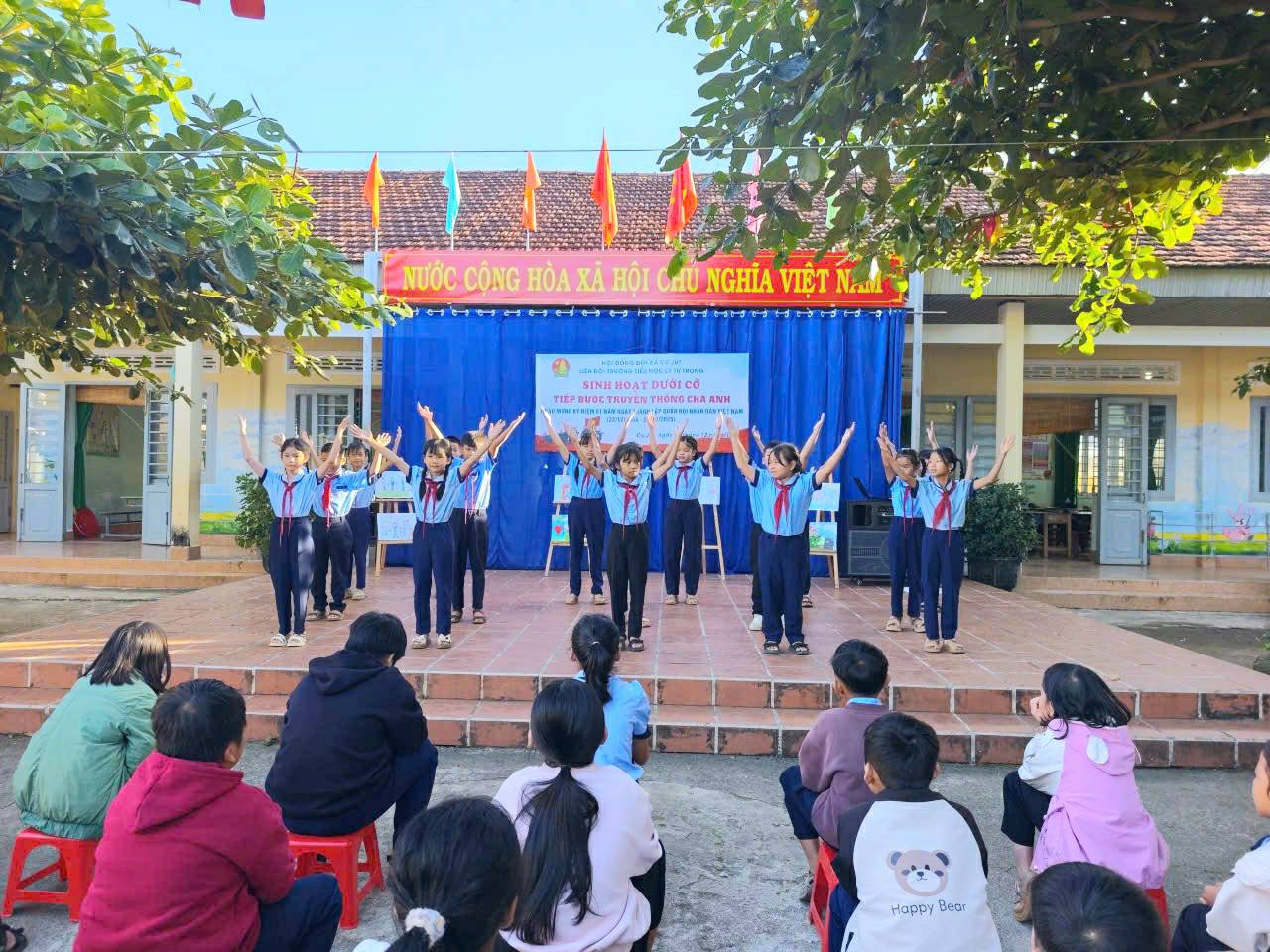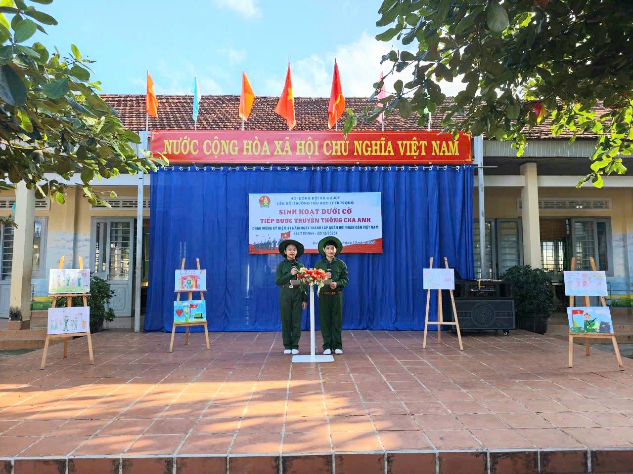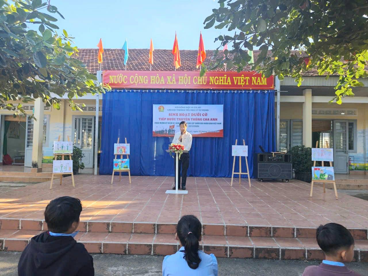 Ngày 22 tháng 12 năm 2025 Liên đội tổ chức sinh hoạt dưới cờ, với chủ điểm “Tiếp bước truyền thống cha anh”. Trong không khí trang nghiêm của buổi sinh hoạt dưới cờ, thầy và trò Trường Tiểu học Lý Tự Trọng cùng nhau ôn lại một mốc son rất đỗi thiêng liêng của dân tộc Việt Nam – Kỷ niệm 81 năm Ngày thành lập Quân đội nhân dân Việt Nam (22/12/1944 – 22/12/2025). Ngày 22 tháng 12 hằng năm không chỉ là ngày truyền thống của Quân đội nhân dân Việt Nam anh hùng, mà còn là dịp để mỗi người dân, đặc biệt là thế hệ học sinh hôm nay, hiểu hơn, tự hào hơn về truyền thống đấu tranh kiên cường, bất khuất của dân tộc và những cống hiến to lớn của các thế hệ cha anh trong sự nghiệp bảo vệ Tổ quốc.